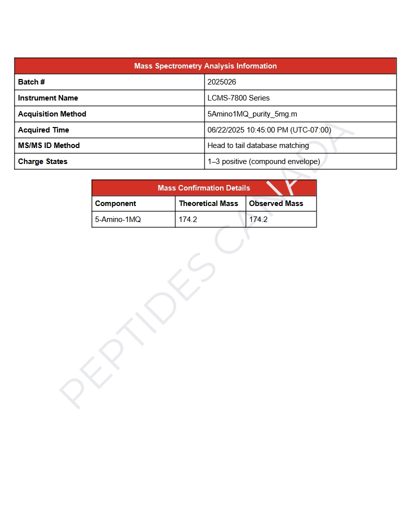 This batch of 5-Amino-1MQ Peptide has been third party lab tested and verified for quality. Size: 5mg Contents: 5-Amino-1-Methylquinolinium Form: Powder Purity: 99.6%