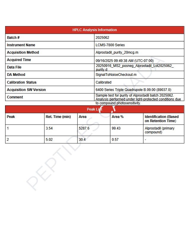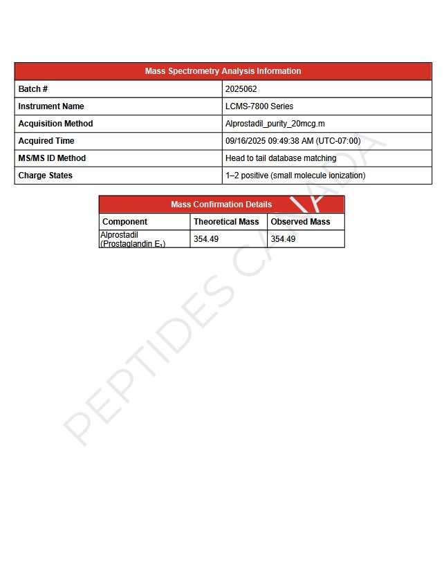 This batch of Alprostadil Peptide has been third party lab tested and verified for quality.