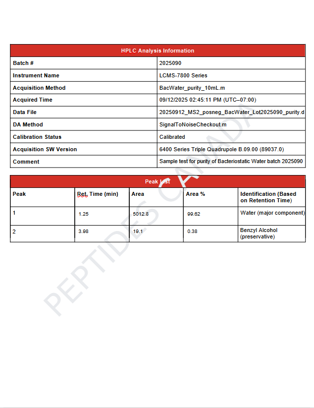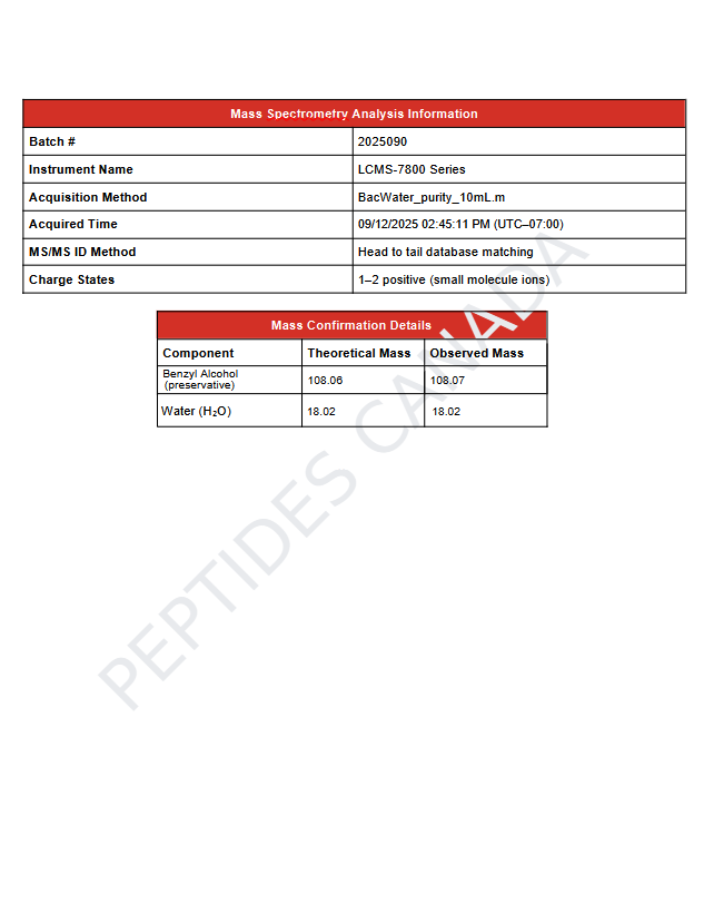 Bacteriostatic Water comprises sterile water (H₂O) supplemented with benzyl alcohol at 0.9% (v/v). Because the solution is a simple preserved aqueous vehicle rather than a defined compound, a single definitive molecular formula beyond the solvent system is not appropriate. Analytical verification for this batch includes mass spectrometric and chromatographic confirmation of water purity and preservative level.