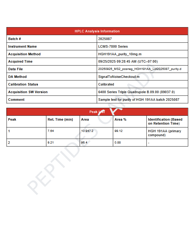 We take a laboratory-first approach to quality. Each batch is made under controlled conditions and verified by an independent lab (HPLC/MS). We only ship batches that test ≥99% purity, and we provide a full COA, including identity, methods, and chromatograms, for your review.