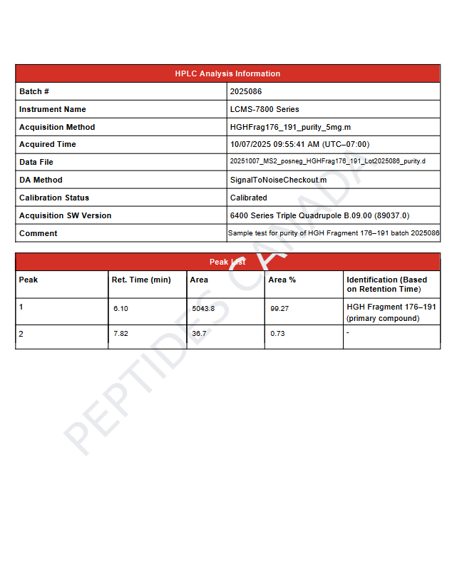 HGH Fragment 176-191 is a defined synthetic peptide representing residues 176–191 of human growth hormone. A standard molecular composition is applicable; analytical confirmation is provided for this batch.