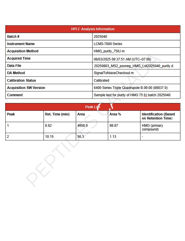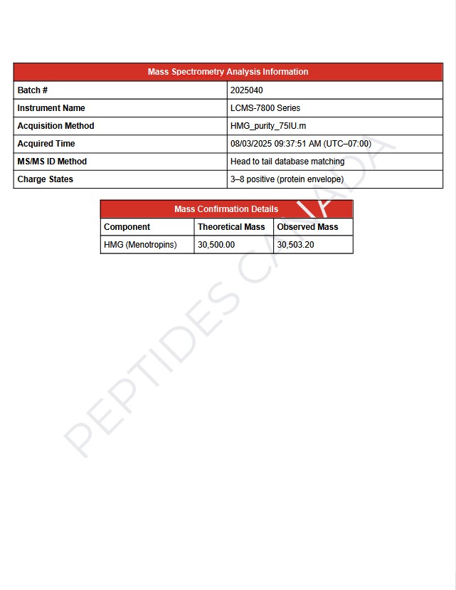 This batch of HMG Peptide has been third party lab tested and verified for quality. Size: 75iu
