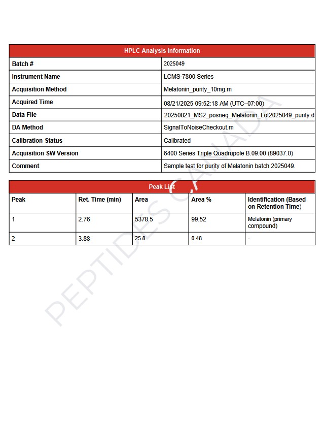 Melatonin (Batch # 2025027) demonstrates a measured molecular mass of 232.3 Da and a confirmed purity of 99.17 %. Analytical validation supports its integrity for use in experimental and analytical research applications exploring circadian biology, neuroendocrinology, oxidative stress, and cellular protection mechanisms. This compound is not intended for diagnostic or therapeutic use.